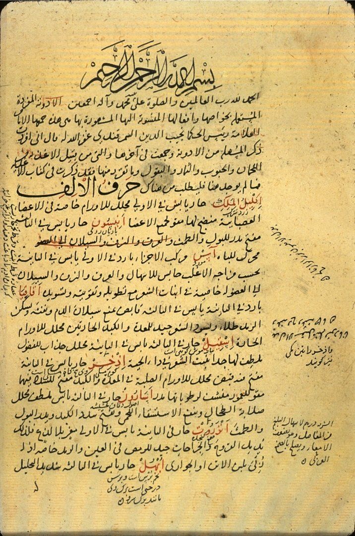 The opening page of al-Adwiyah al-mufradah al-musta‘malah bi-khawaṣṣhā wa-af‘ālhā al-mashhūrah bi-hā bi-hā (Useful Simple Remedies with Their Properties and Utilities for Which They are Renowned) by Najīb al-Dīn al-Samarqandī (d. 1222/619). The copy was made during the last ten days of Ramadan 740 (= March 1340) by the copyist Muḥammad ibn ‘Abd Allāh, known as al-Shams al-Tasatturī the physician (al-mutaṭabbib). There are Persian marginal and interlinear annotations.