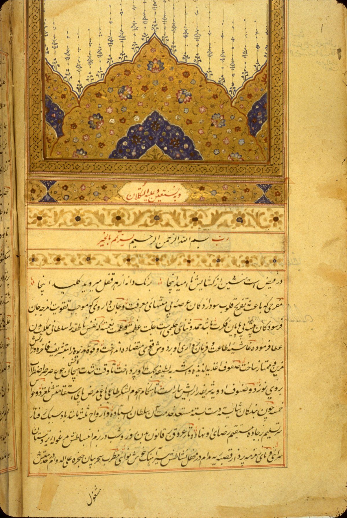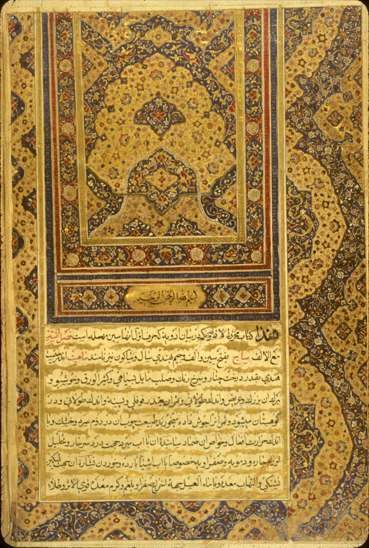 The left-hand side of an illuminated double-opening that begins one fascicle of a presentation copy of a pharmacopoeia apparently taken from the Jāmi‘ al-javāmi‘-i Muḥammad-Shāhī by Hakim ‘Alavī Khān (d. 1747/1160 or 1749/1162), which was dedicated to and named for the Mughal emperor Muḥammad-Shāh.