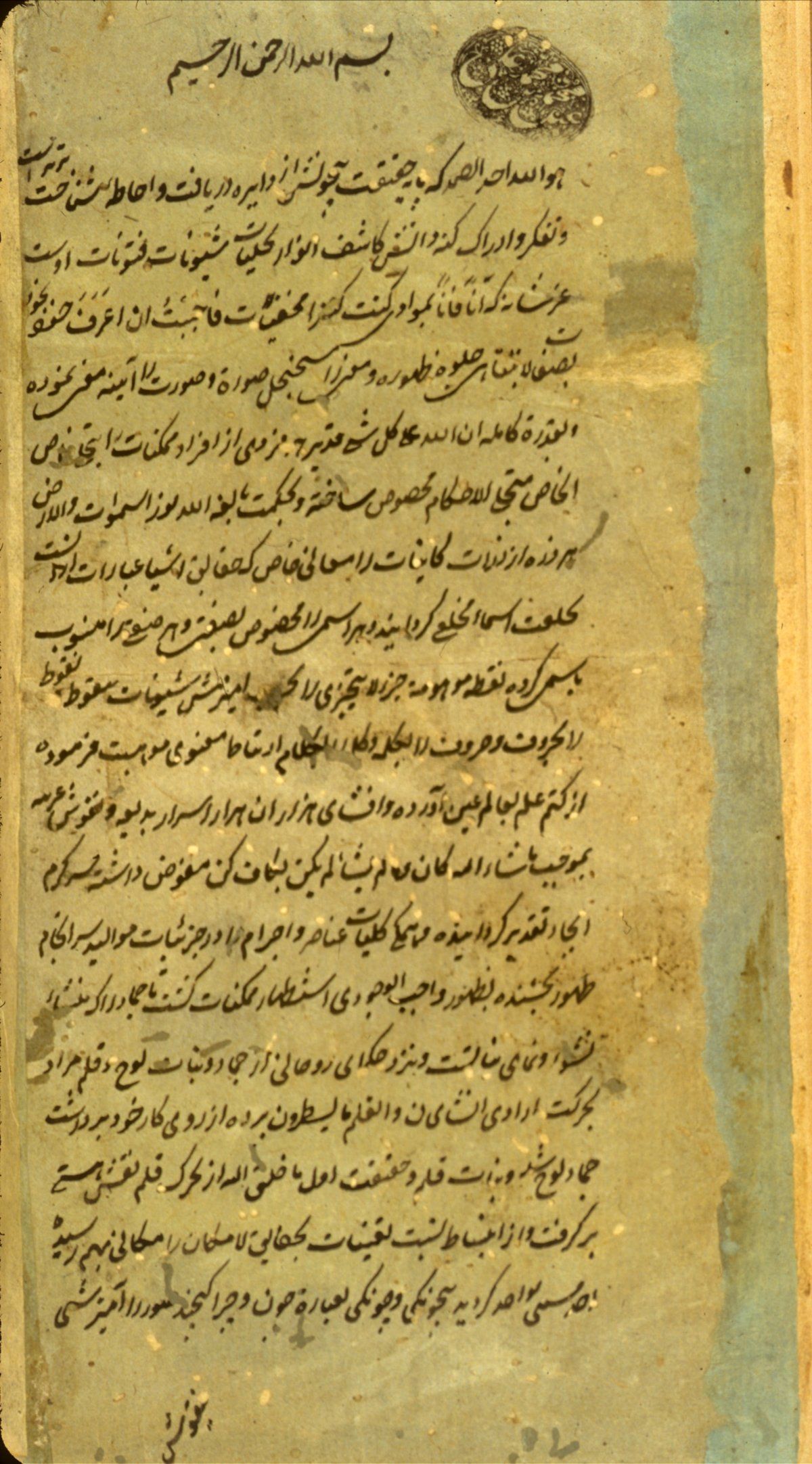 The opening of a Persian pharmacological dictionary composed in 1628/1038 by Nūr al-Dīn Muḥammad ‘Abd Allāh Shīrāzī. The treatise was dedicated to the Mughal Emperor Shah Jahan. The copy was made in 1719/1131. Near the top is an impression of an oval owner's stamp bearing the name ‘Abd [Allāh] Muḥammad ibn Muḥammad ‘Alī and dated 1268 (= 1851). The manuscript is made of paper dyed blue. The outer edge of the folio has been repaired with a very brighter blue paper.