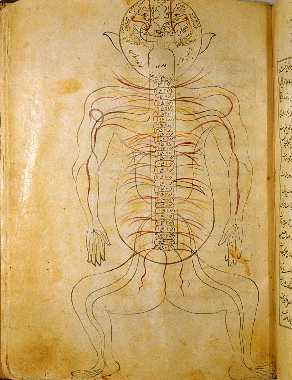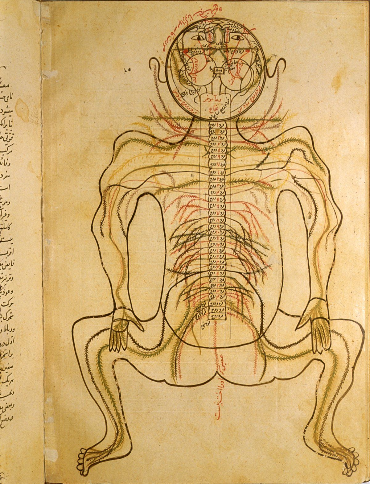 The nervous system, with the figure drawn from the back and the nerves indicated in opaque watercolors. Copy completed by scribe Ḥasan ibn Aḥmad, working in Isfahan, on 8 December 1488 (4 Muharram 894 H).