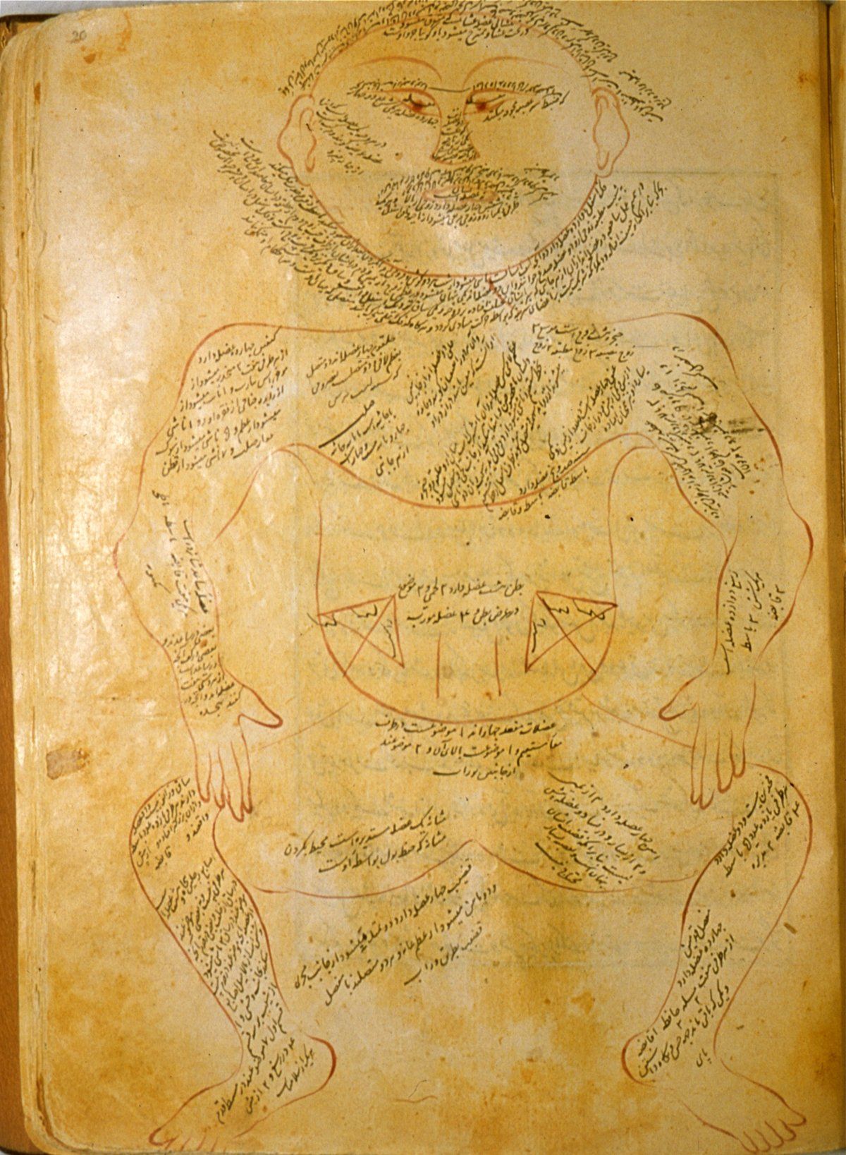 The muscle figure, shown frontally, with extensive captions describing the muscles. Copy completed by scribe Ḥasan ibn Aḥmad, working in Isfahan, on 8 December 1488 (4 Muharram 894 H).