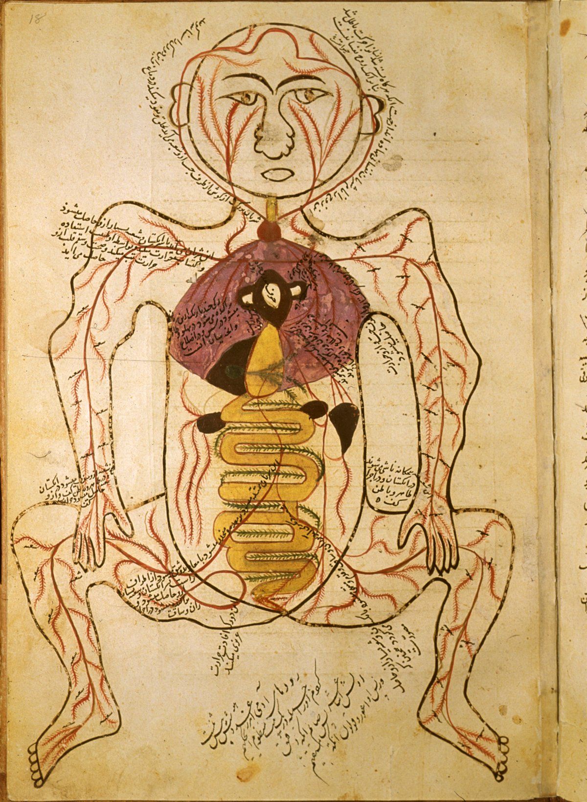 The arterial figure, shown frontally with the internal organs indicated in opaque watercolours. An undated and unsigned copy, probably 15th or early 16th-century.