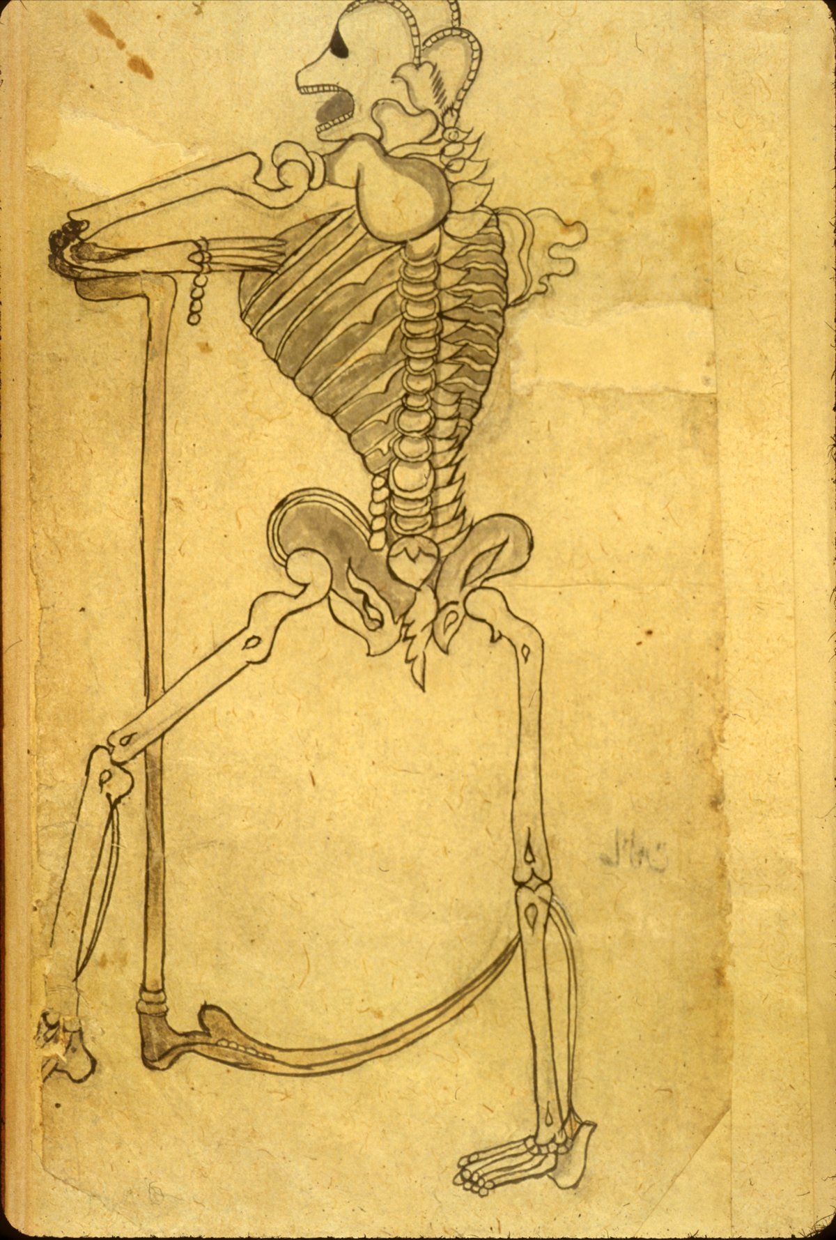 A drawing in ink and light-gray wash of a skeleton leaning on a scythe. One of six leaves of anatomical drawings appended to a Persian translation of an Arabic medical compendium. The figure shows some knowledge of the illustrations of Vesalius's Fabrica (possibly available through intermediate interpretations). Undated and unsigned, probably 18th-century, India.