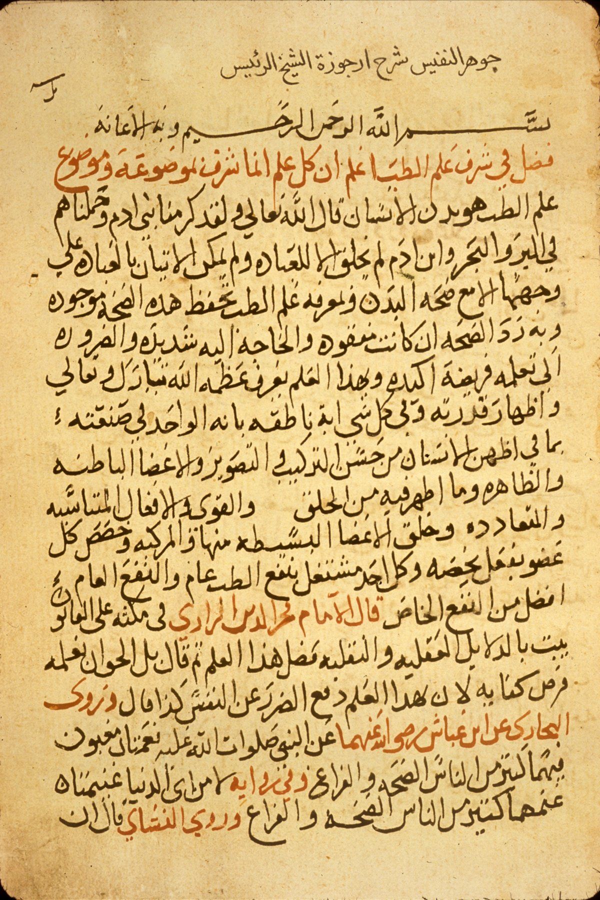 The opening essay on the pre-eminence of medicine which precedes a commentary on the didactic medical poem of Ibn Sīnā (Avicenna) that was written by Mūsá ibn Ibrāhīm al-Baghdādī (d. 1471/876). The copy was made in 1630/1040 from an exemplar copied in 1487/892, about ten years after the author's death.