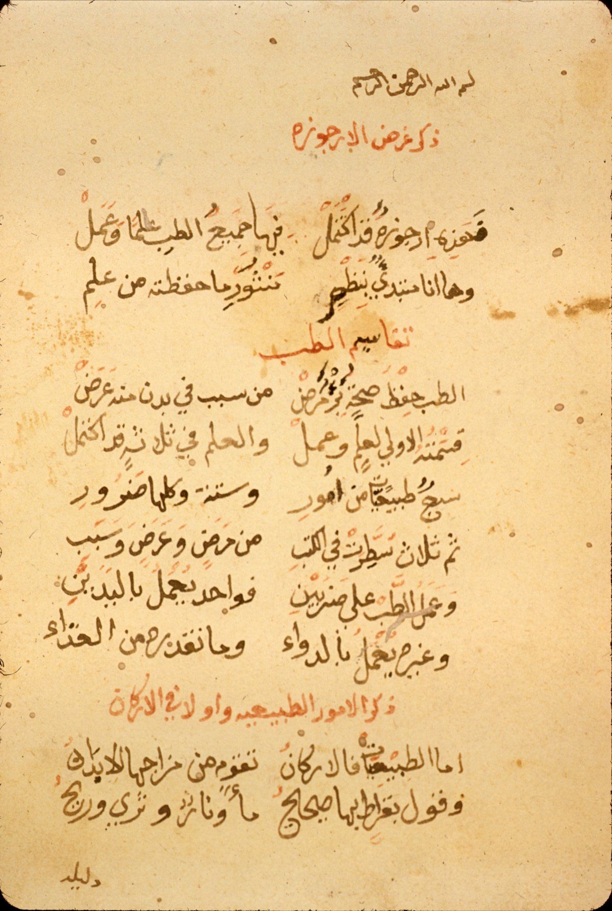 The opening of the popular didactic poem on medicine by Ibn Sīnā (Avicenna). The copy is undated, possibly 17th century.