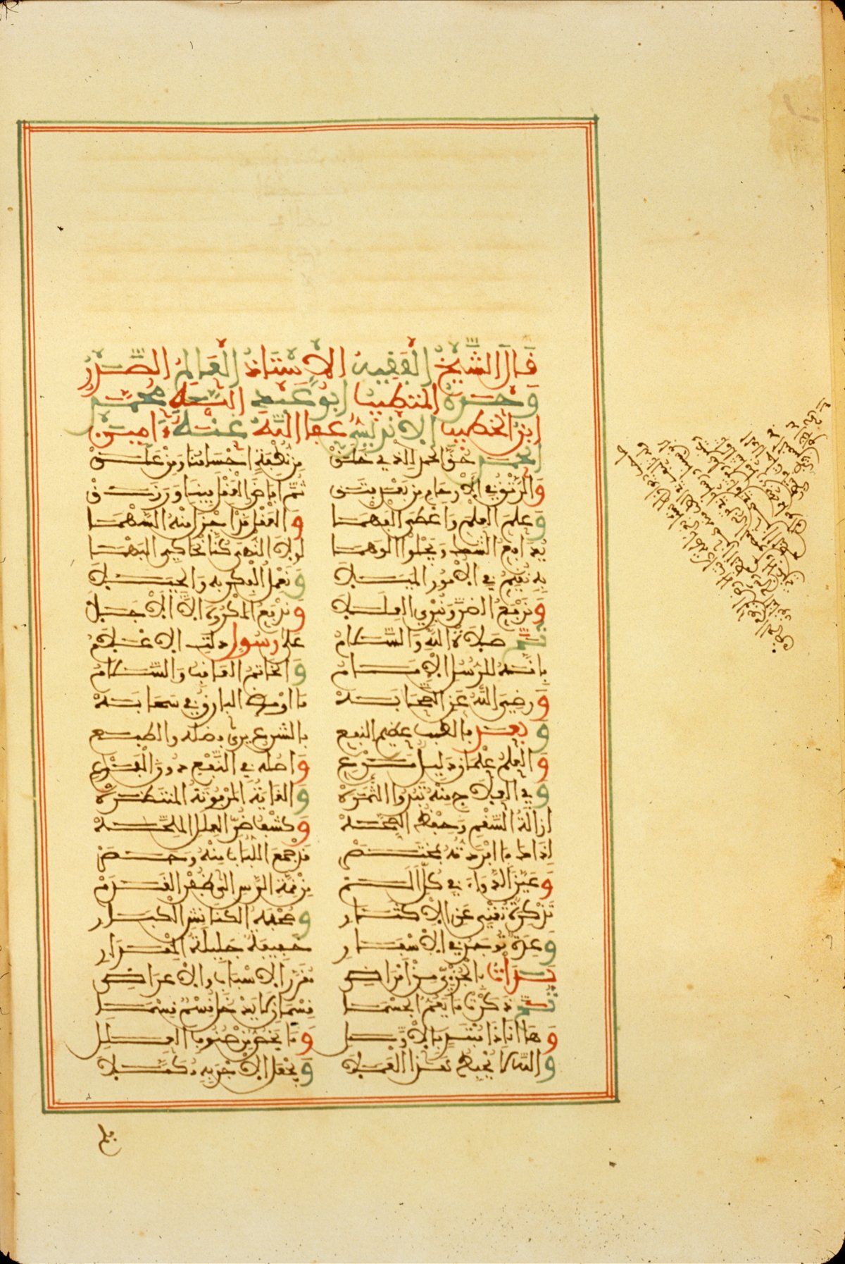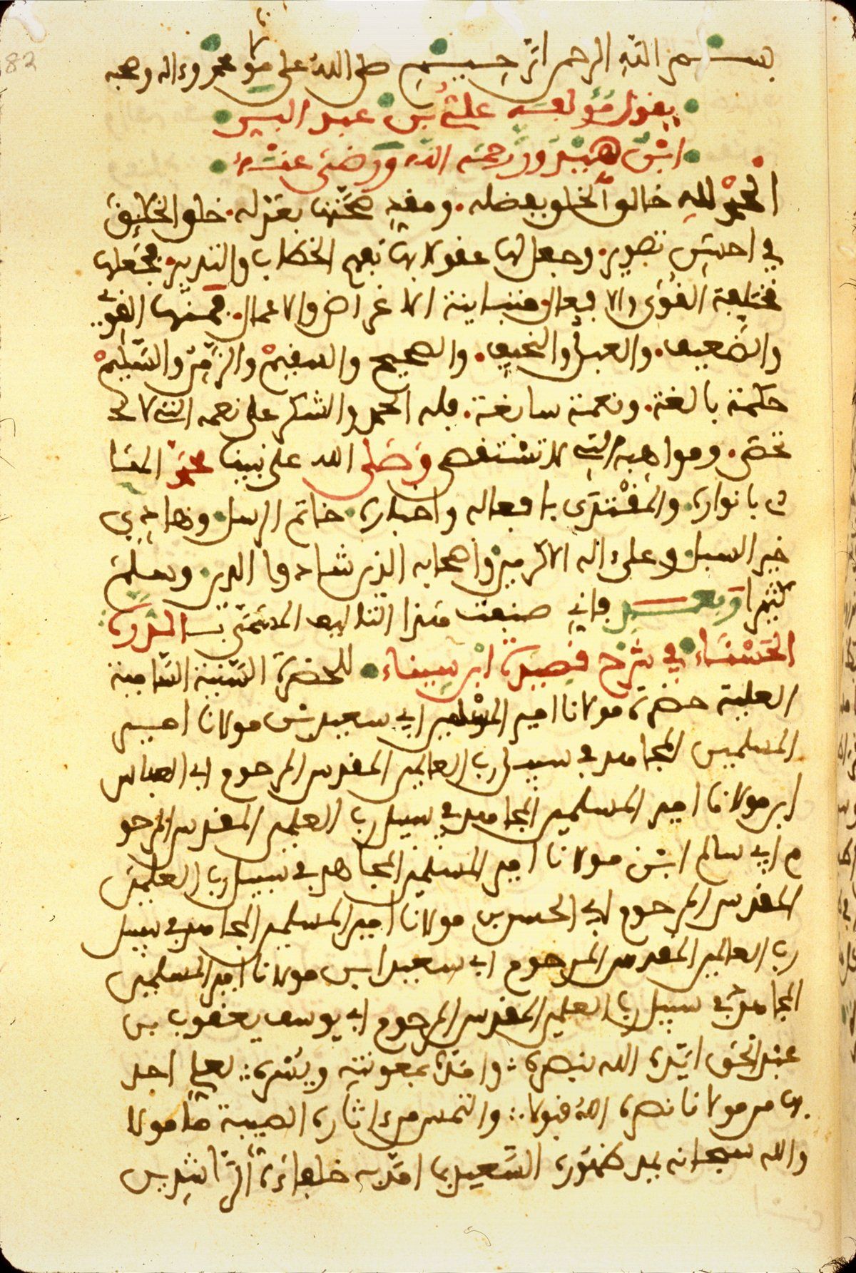 The opening of a commentary on Ibn Sīnā's [Avicenna's] famous poem written by ‘Alī ibn ‘Abd Allāh ibn Haydūr, who died in 1413/816 H. This is the only recorded copy of this commentary. It is undated and was made in North Africa probably in the 18th century.