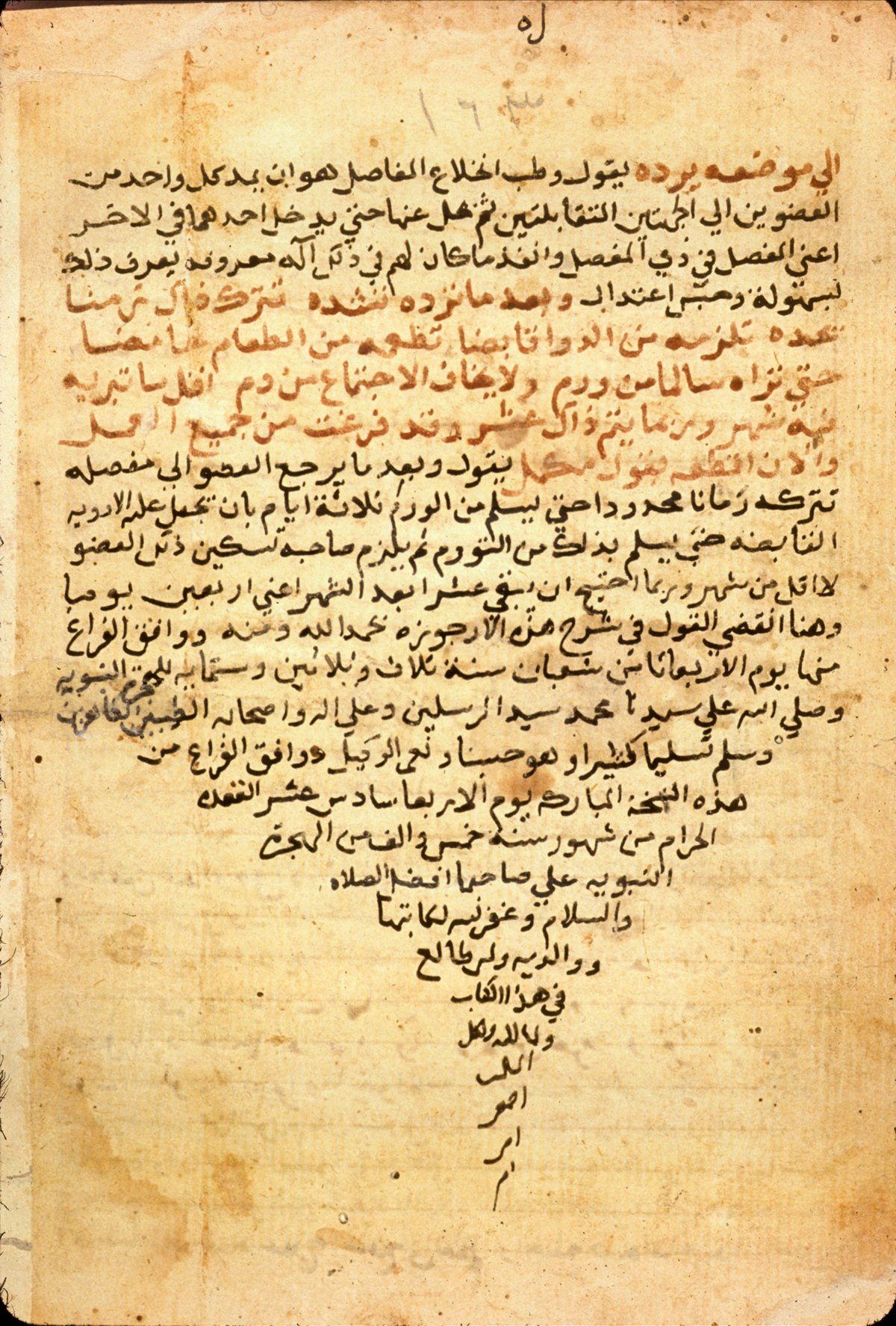 The colophon from a copy of Ibn Rushd's (Averroes) 12th-century commentary on the Poem on Medicine written by Ibn Sīnā (Avicenna). According to this colophon, the copy was completed on the 16th of the month of Dhu al-Qa‘dah 1005 [1 July 1597] from a copy finished on 8 Sha‘ban 633 [15 May 1236].