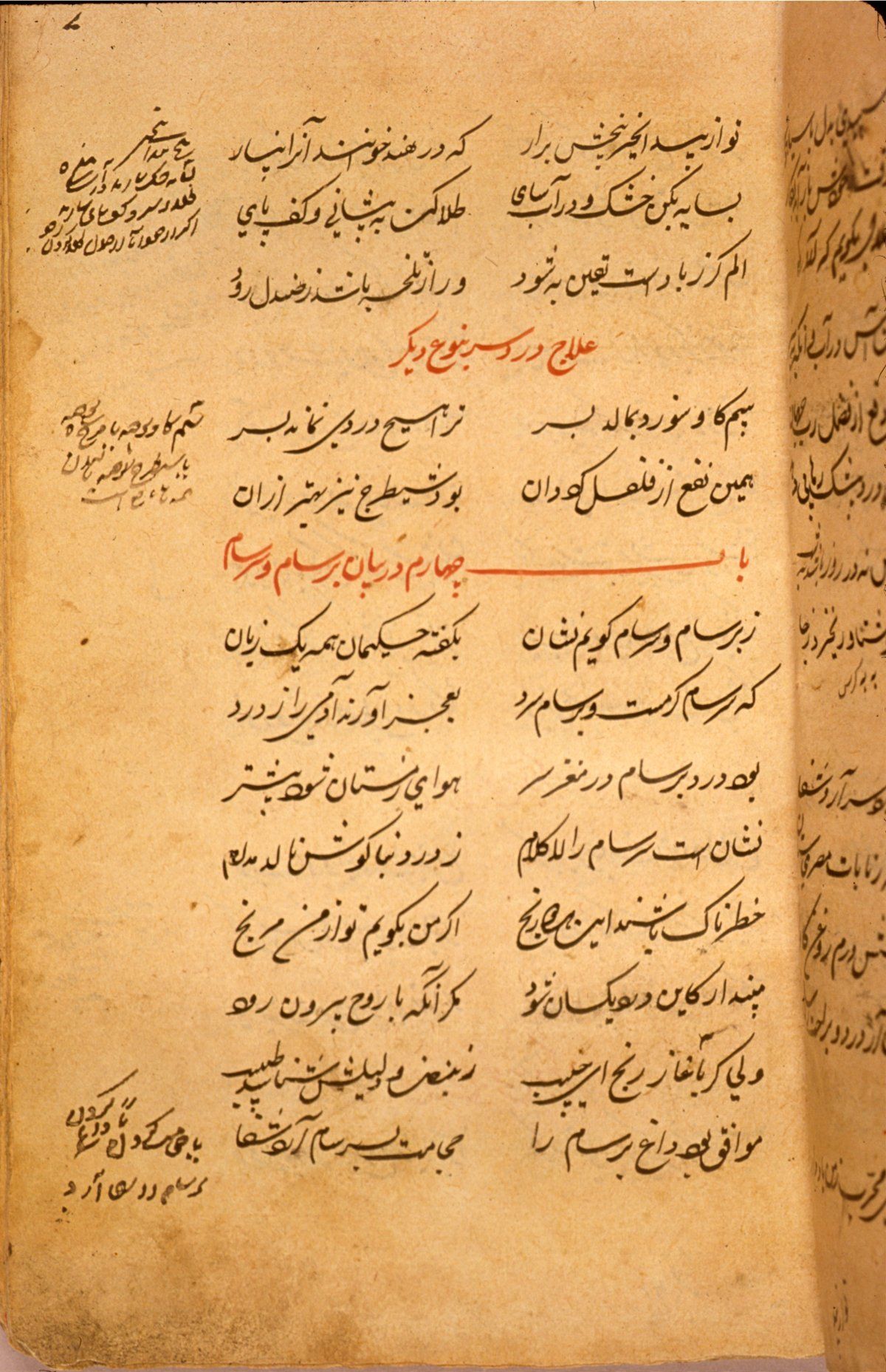 A sample folio from the late 14th-century Persian metric compendium on therapeutics by Shihāb al-Dīn Nāgawrī. The copy is undated, possibly 17th century.
