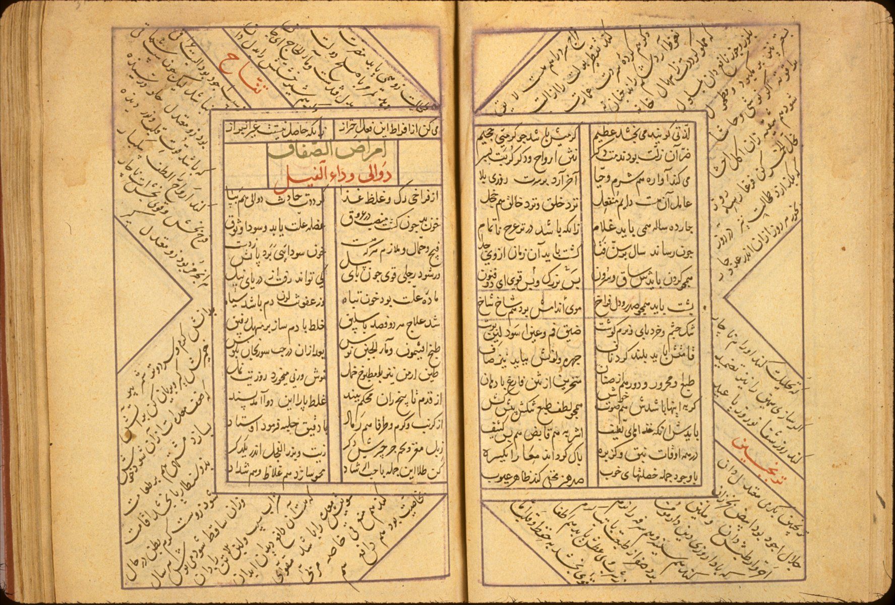 An opening from the Persian didactic poem by ‘Alī ibn shaykh Muḥammad ibn ‘Abd al-Raḥmān, who may have lived in the late 17th century. The subjects under discussion are "the malady of the elephant" (da' al-fil, or elephantiasis) and varicosity (al-sifaq al-dawali). The copy is undated but must predate 1791, when an owner's stamp was added.
