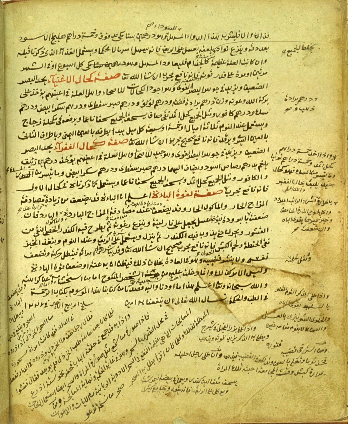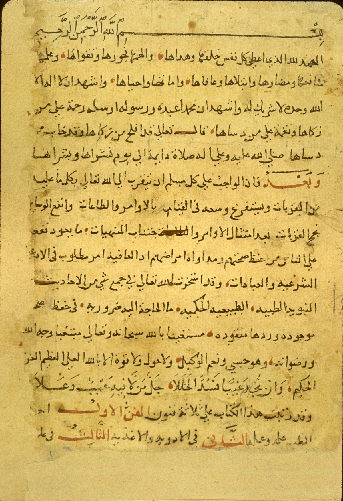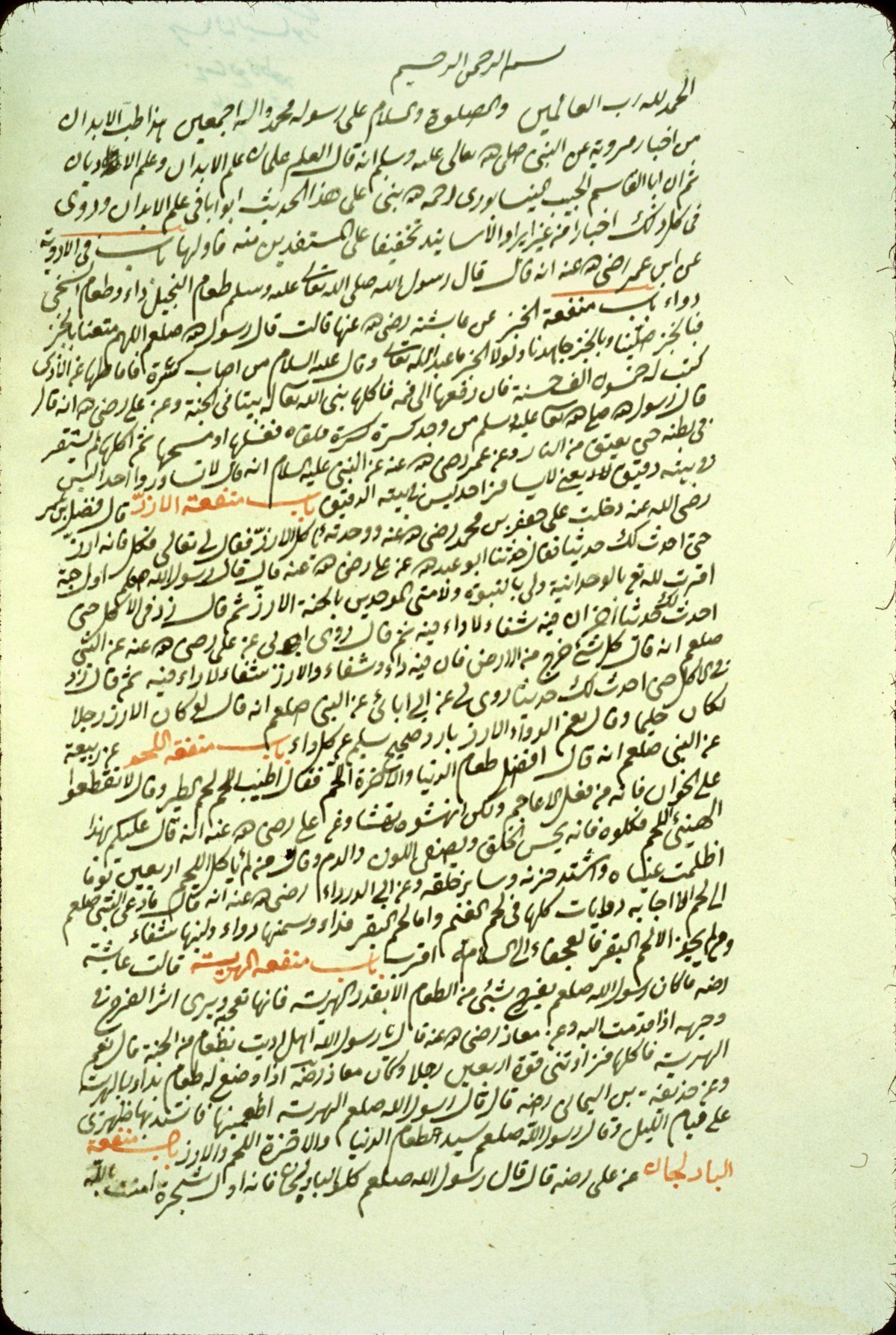 The opening page of a treatise on Prophetic Medicine as it relates to foods and spices by Abū al-Qāsim al-ḥabīb al-Naysābūrī (fl. 1750). It is the only recorded copy this treatise titled Fi manāfi‘ al-aṭ‘imah bi-l-aḥādīth. The copy was completed in the month of Jumadá I 1206 (= 27 December 1791 to 25 January 1792) by the scribe Yūsuf al-Rasanāwī ibn Ismā‘īl, who copied it for Mahmud Efendi in Constantinople.