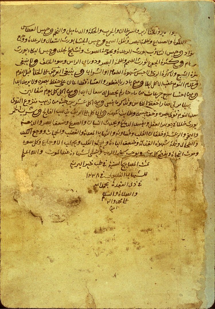 The final page of a treatise on Prophetic Medicine by Shihāb al-Dīn al-Qalyūbī (d. 1659/1069). In the colophon shown here it is stated that the copy was completed in the month of Dhu al-Qa‘dah 1228 (= 26 October to 24 November 1813). The copyist is not named. The nature of the paper and script suggests that it is an Indian product.