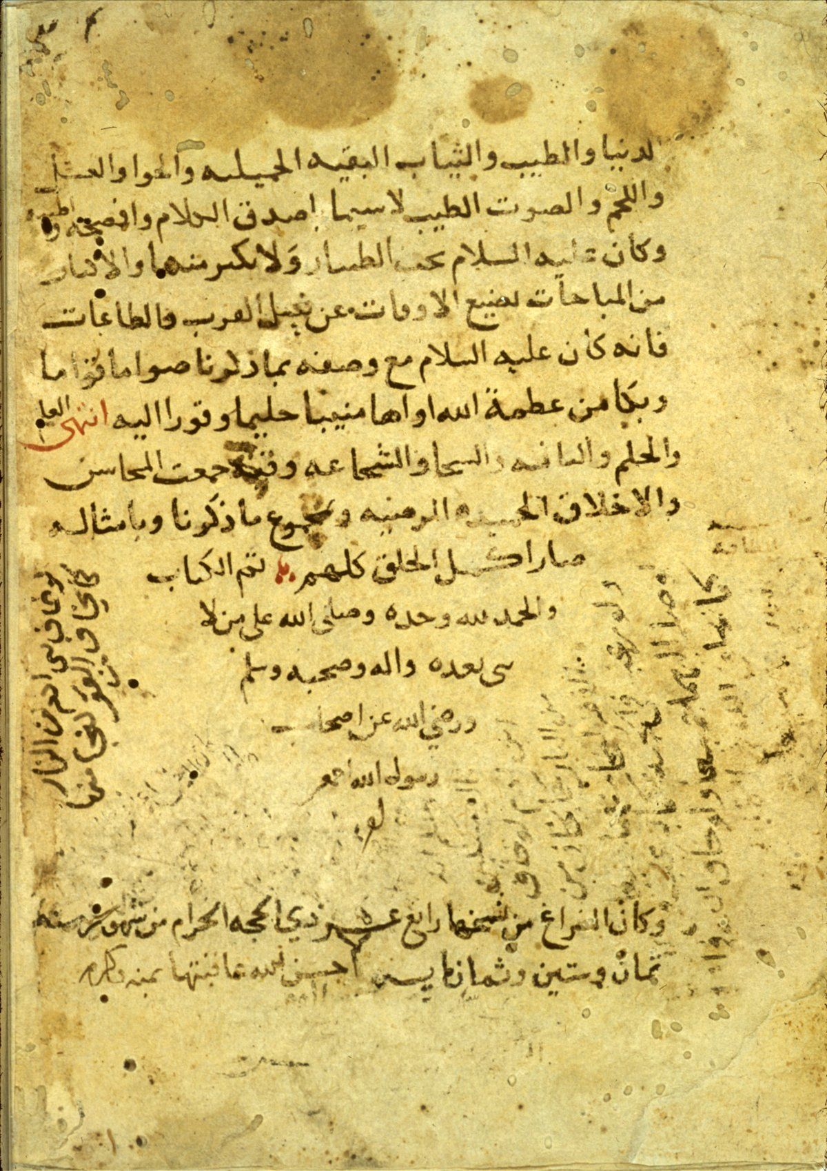 The final page of the treatise on Prophetic Medicine by al-Dhahabī (d. 1348/748). The copy is dated in the colophon (the bottom two lines) 14 Dhu al-Hijjah 868 (= 19 August 1464). The scribe is not named, but the appearance of the paper, ink, and script suggest that it is a Syrian/Egyptian copy. Later notes have been written vertically across the lower half of the page.